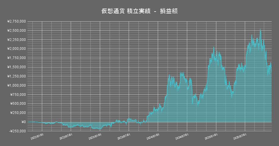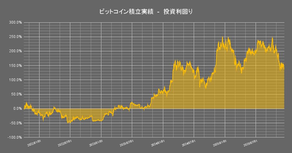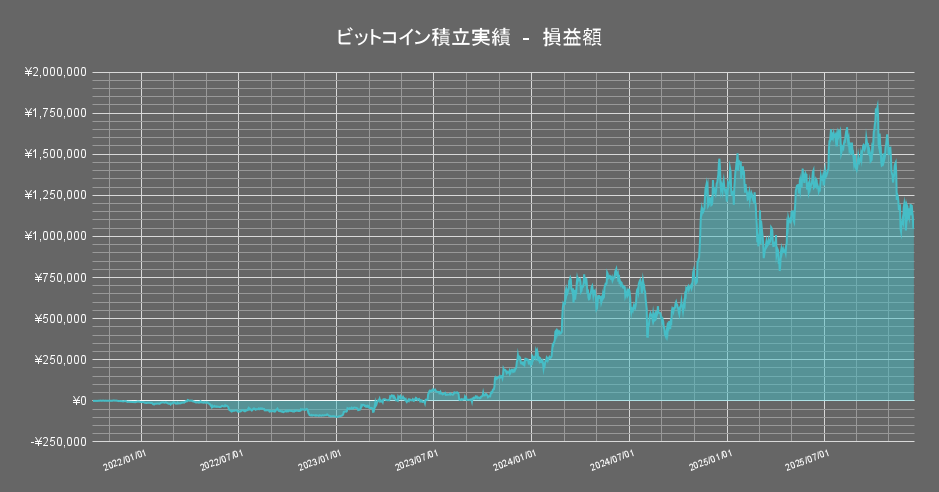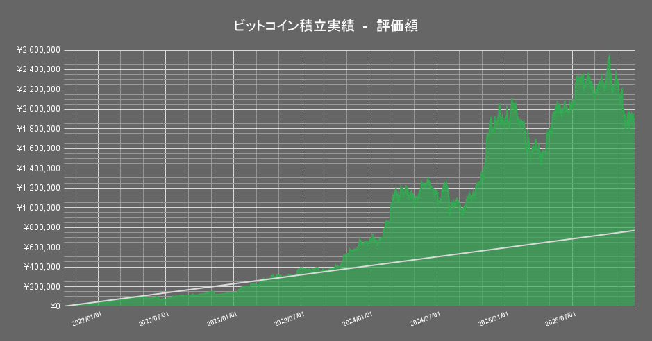保有する暗号資産のうち「ビットコイン」の積立投資成績の推移は以下の通りです。(積立1538日目時点)