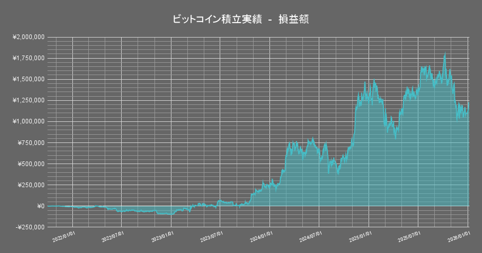 保有する暗号資産のうち「ビットコイン」の積立投資成績の推移は以下の通りです。(積立1559日目時点)