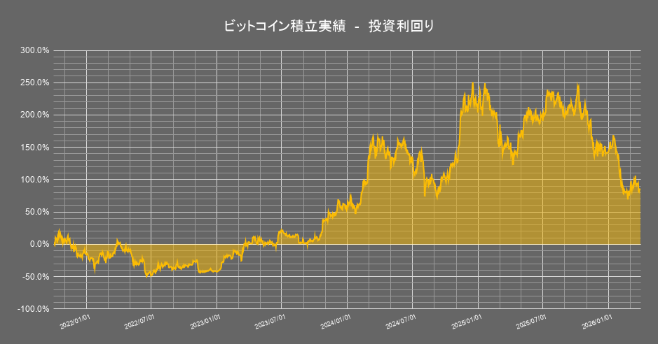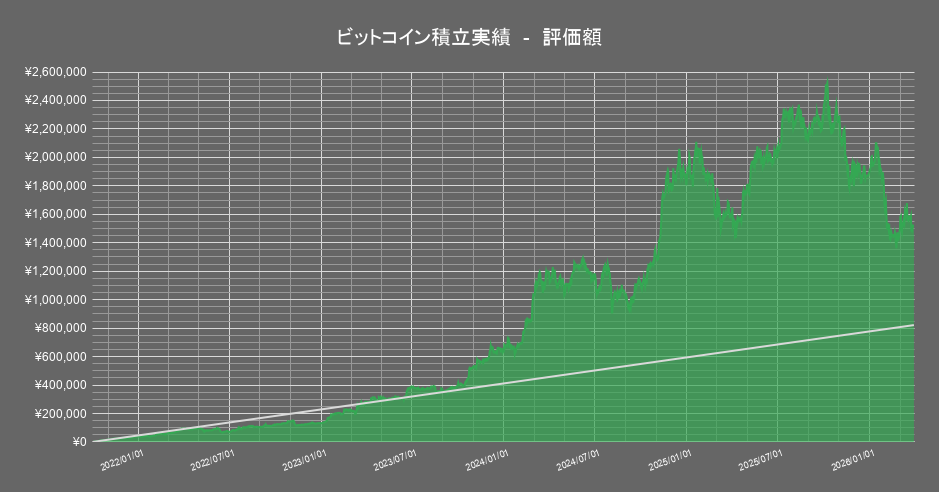 保有する暗号資産のうち「ビットコイン」の積立投資成績の推移は以下の通りです。(積立1643日目時点)
