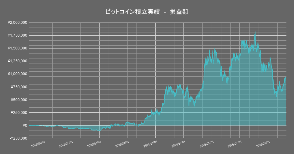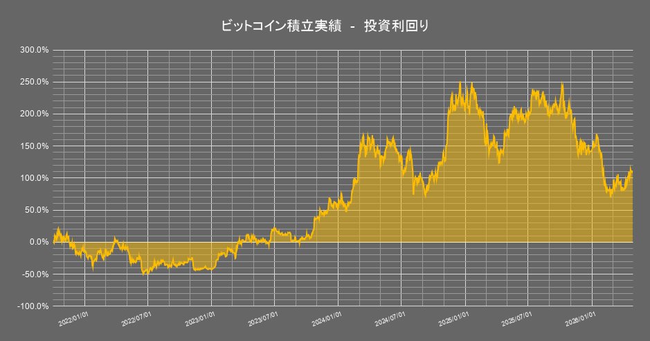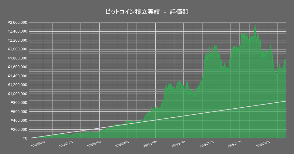 保有する暗号資産のうち「ビットコイン」の積立投資成績の推移は以下の通りです。(積立1671日目時点)